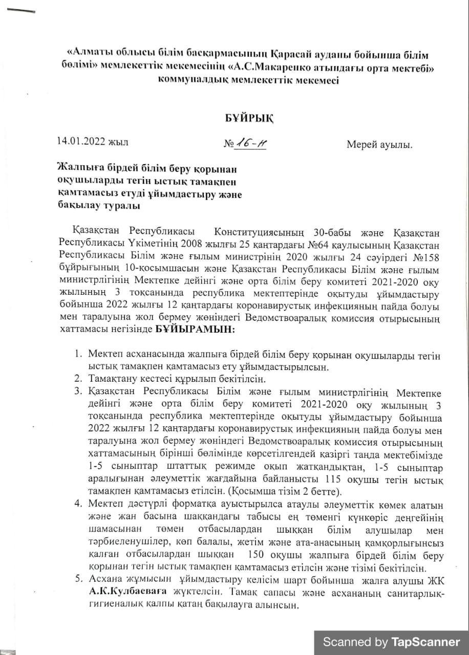 17 январь 2022 0 1 2 3 4 5 Жалпыға бірдей білім беру қорынан оқушыларды тегін ыстық тамақпен қамтамасыз етуді ұйымдастыру және бақылау туралы