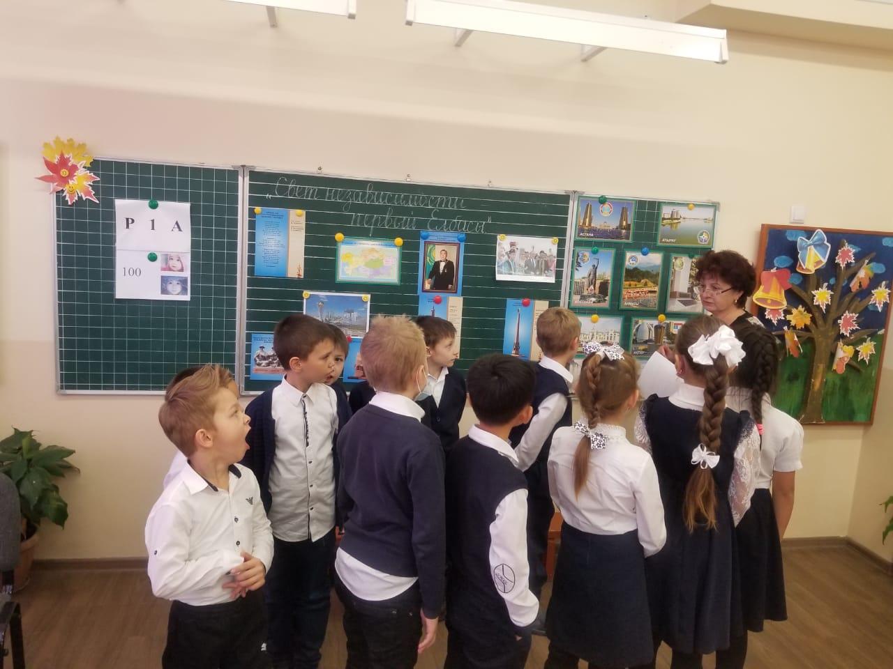 Бүгін мектебімізде қазақ халқының тұңғыш президенті Нұрсұлтан Әбішұлы Назарбаевтың өмір жолы, туып-өскен, оқып білім алған, қызмет еткен жерлері туралы, Елбасының өмірімен шығармашылыққа толы атқарылған істері туралы, шәкірт жүрегінде Елбасының елі үшін жасаған істерін үлгі өнеге ретінде айтып, Елбасына деген сүйіспеншілік сезімін ояту мақсатында "Тәуелсіздіктің нұры — тұңғыш Елбасы" тақырыбында ашық сынып сағаттары өтті.