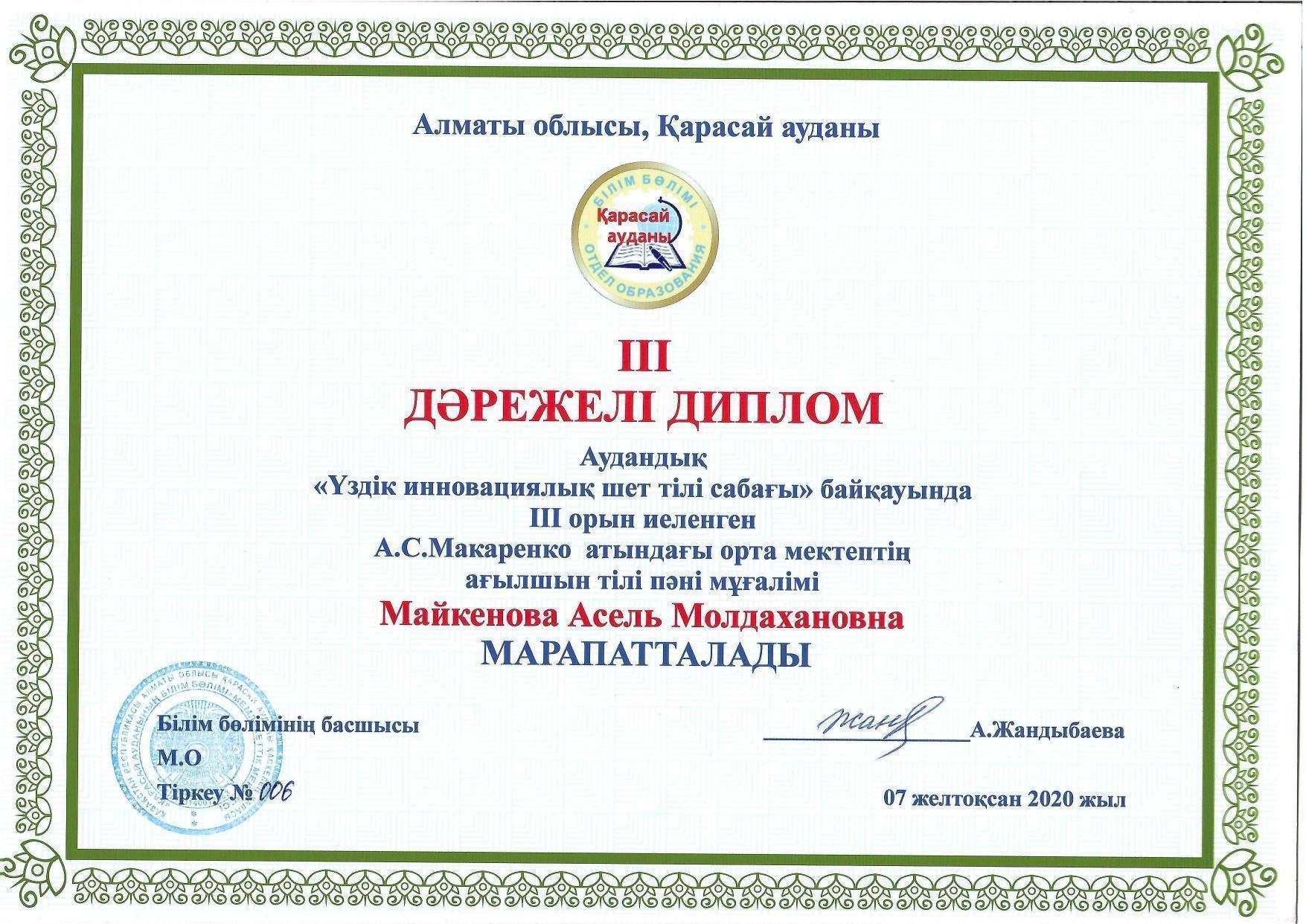 22 декабрь 2020 0 1 2 3 4 5 Аудандық "Үздік инновациялық шет тілі сабағы" байқауында ІІІ дәрежелі дипломмен марапатталған Майкенова Асель Молдаханқызын жеңісімен құттықтаймыз!