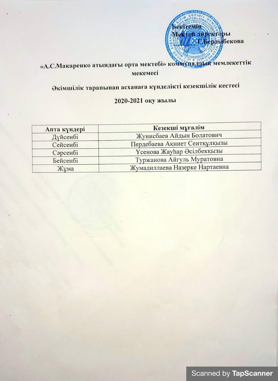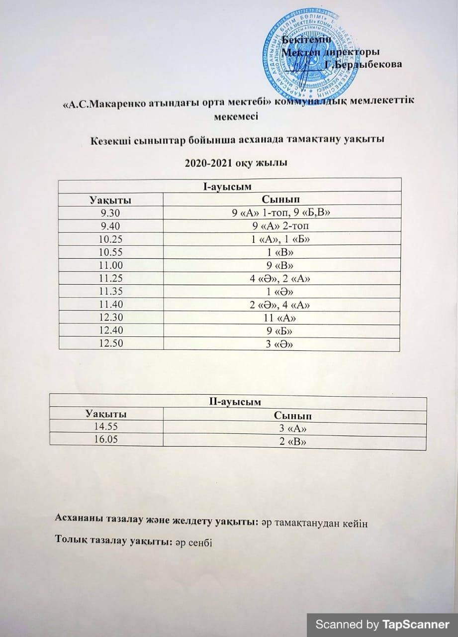 Тамақтандыру бойынша кезекшілік кестесі, оқушылардың тамақтану кестесі » Макаренко атындағы орта мектебі
