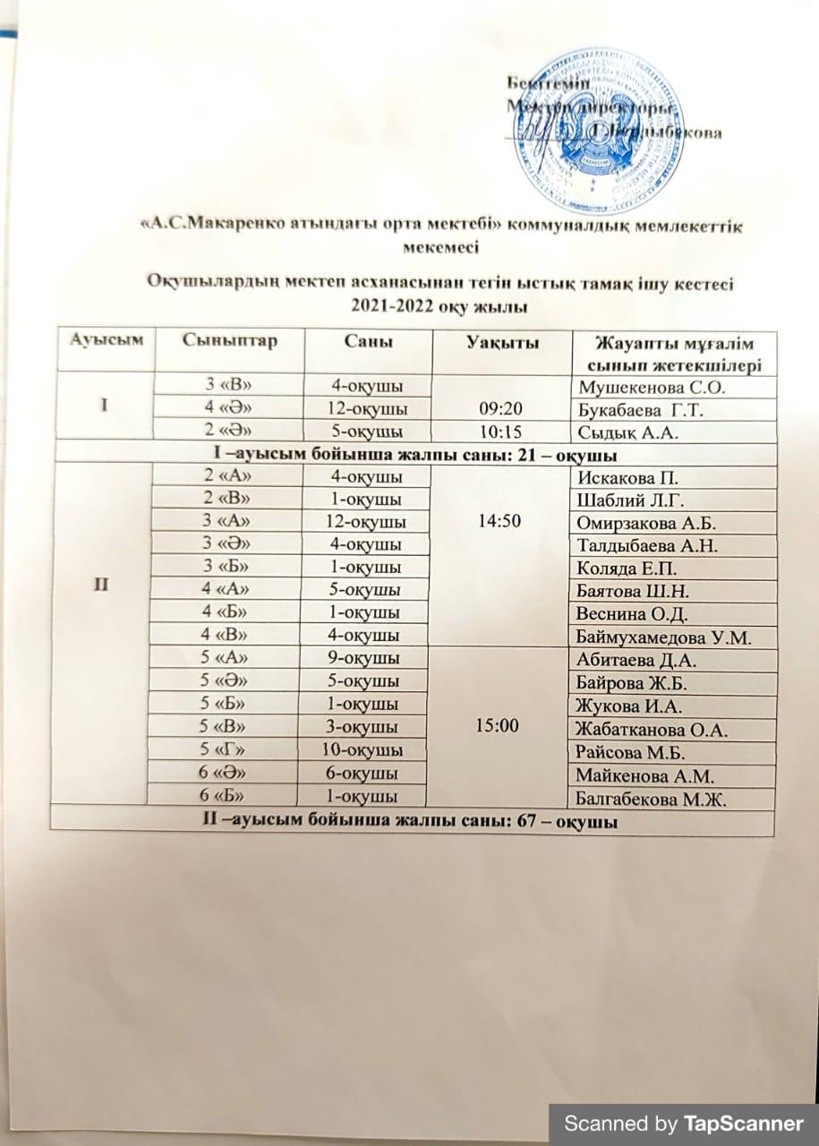 Тегін ыстық тамақ ішу кестесі » Макаренко атындағы орта мектебі